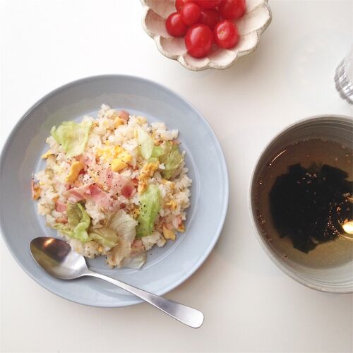 雪ー!!よく降ったよー!!・ベーコンレタス炒飯・ワカメスープ・ミニトマト出勤前から雪降り始めて、さっきまで吹雪まくり。もう溶け出したけどね。あっちゅー間。夜凍らないといーなー。ベーコンと卵の賞味期限が切れてた。レタスはーーー、いつ貰ったか…